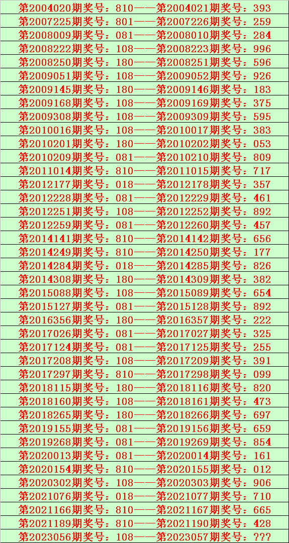 胪列三第2023056期开出奖号108,该号码历史上组选出现40次,前39次开出之后期下期奖号为:393、259、284、996、596、926、183、375、595、383、053、809、717、357、461、892、457、656、177、826、382、654、892、222、325、255、391、099、820、473、697、659、854、161、012、906、710、665、428,详见下表: