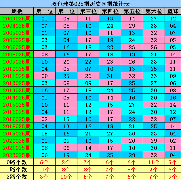 第二位:历史同时0路红球开出:09、15;1路红球开出;04、07、13、16、19、25;2路红球开出;05、08、11、17、20,红球012路个数比为2:8:10,面前0路红球历史同时轮空2年,本年同时密致0路红球出现,参考号码09。